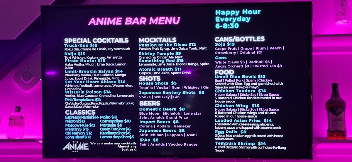 If you're craving something exciting and different, the Anime Bar Menu is exactly what you're looking for. Located at 11773 S Texas 6, Sugar Land, TX, this unique spot combines delicious food with a fun, vibrant atmosphere inspired by your favorite anime shows. From savory appetizers to hearty entrees, every dish is crafted to bring bold flavors with a twist of creativity. Whether you're in the mood for a juicy burger, fresh sushi, or something entirely new, the menu offers a variety of options that will definitely satisfy your taste buds. And don't forget to pair your meal with one of their refreshing drinks, designed to perfectly complement the vibrant dishes. The Anime Bar is all about creating an experience, where the food is just as exciting as the ambiance.